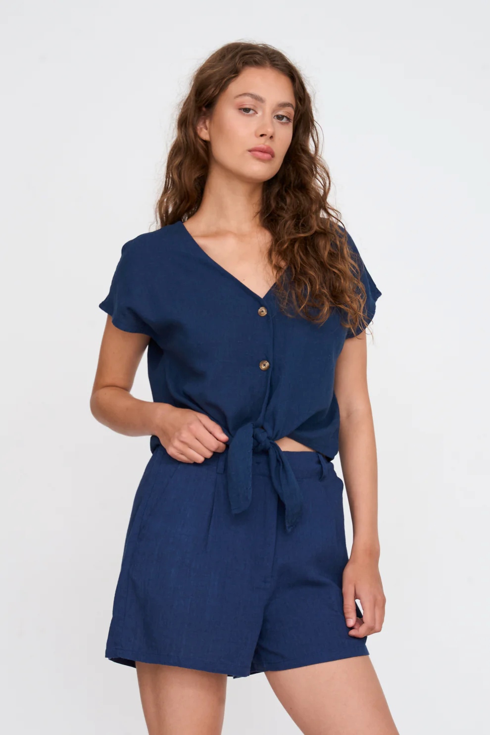 Shorts with concealed button and pleats in blue