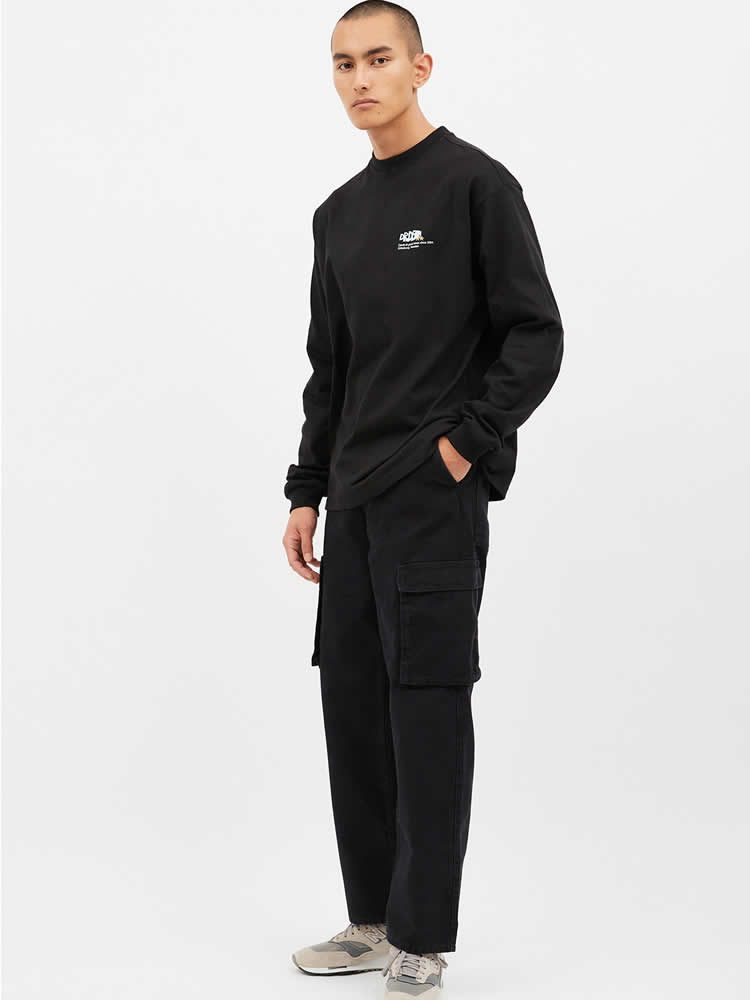 Loose fit utility style pant with wide, straight legs and a dropped crotch. The back-rise has a traditional straight anti fit cut. Made from a rigid twill fabric.
