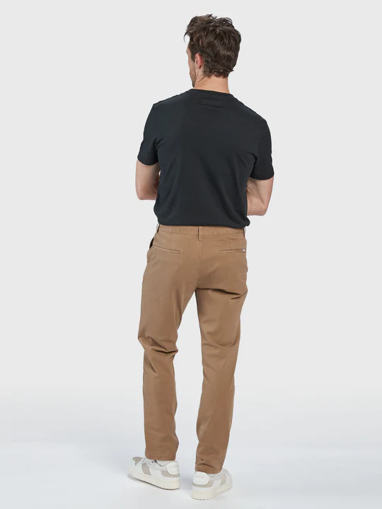 An elegant and classic chino pant with a regular fit, French pockets, and logo rivet at the right back pocket.