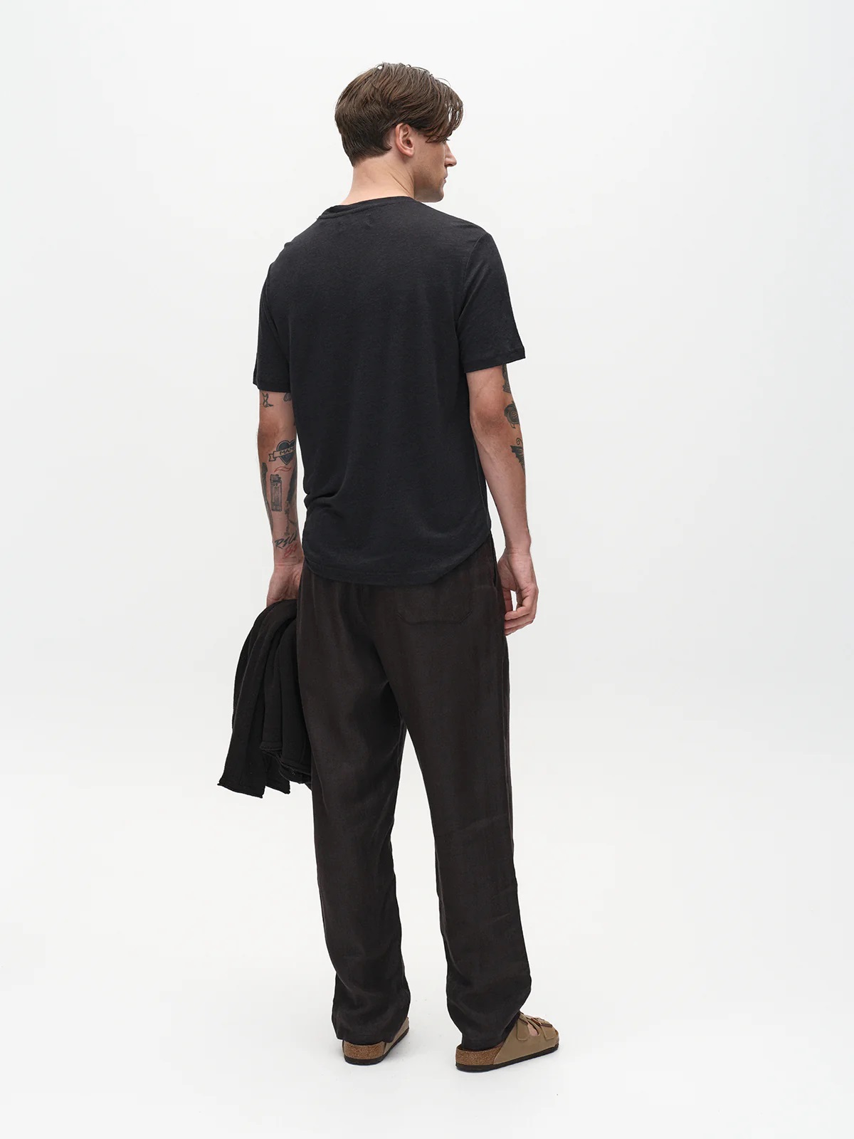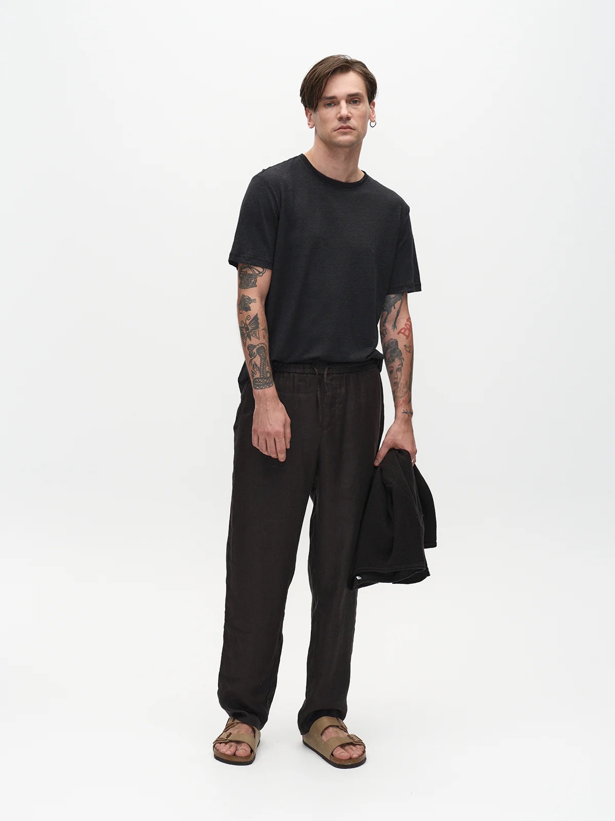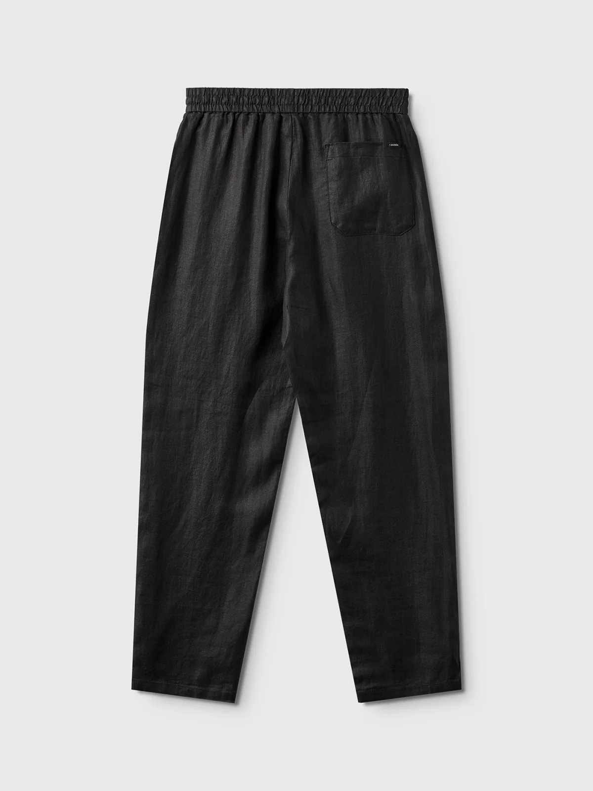 They sit comfortably on the legs, offering a breezy feel. The pants feature side pockets and a creative back pocket with drawstrings on the front for closure. Made from 100% linen.