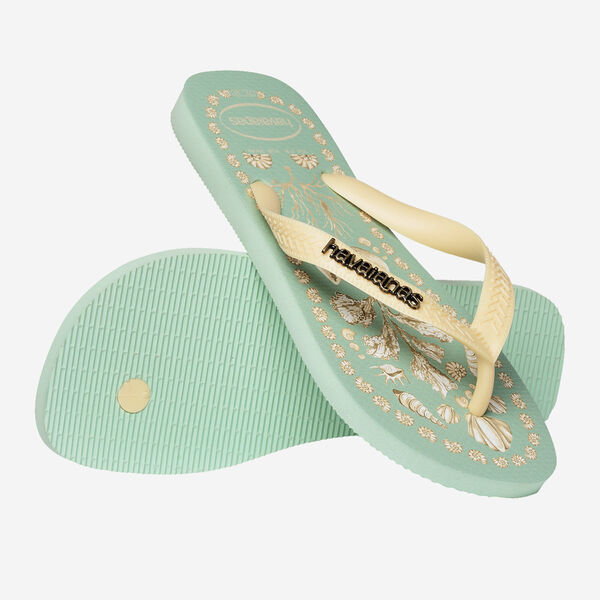 The standout feature is the iconic Havaianas logo, now in a sleek metallic version on the straps, adding a touch of elegance to the vibrant tropical aesthetic.