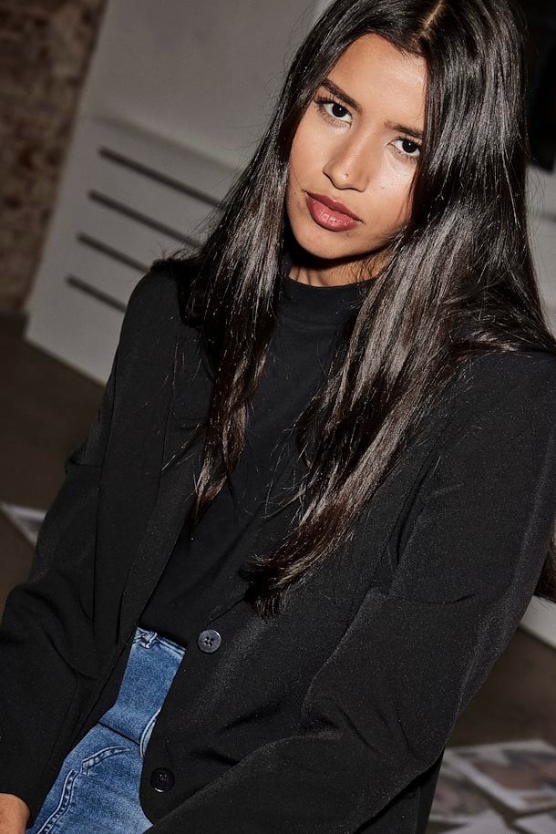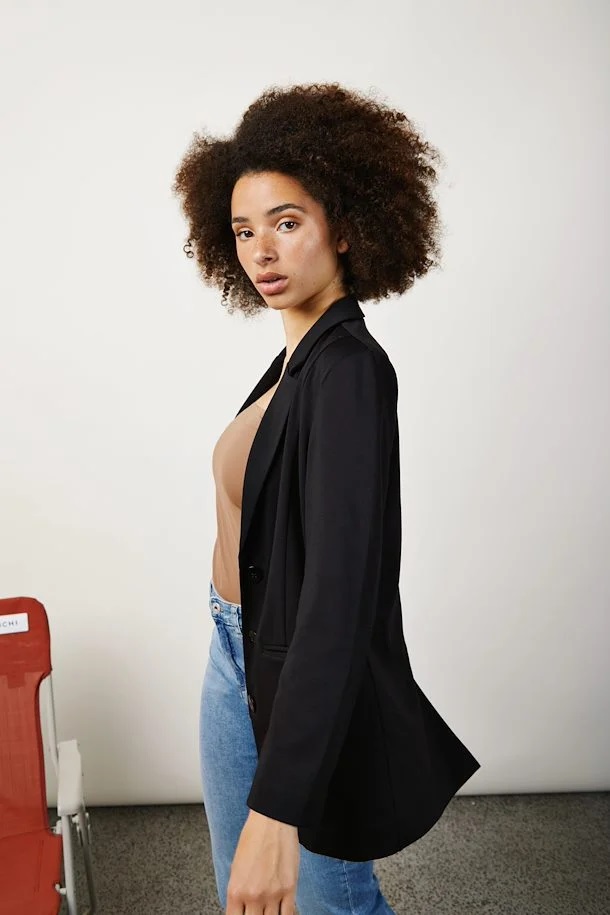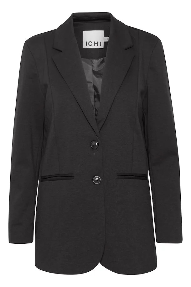- Introducing a high-quality blazer from Ichi. This blazer offers a comfortable and stylish fit with its Kate silhouette, combining elegance and comfort. With its loose fit, this blazer allows for ease of movement and a modern look. Designed for a full-length style and featuring long sleeves, it adds a touch of sophistication to any outfit. Made with a blend of recycled polyester, viscose, and elastane, this blazer is not only fashionable but also environmentally-friendly. This versatile piece can be easily styled with various outfits, making it a must-have addition to your wardrobe. Pair it with a tailored blouse and trousers for a professional ensemble, or dress it down by layering it over a casual top and jeans. Complete the look with accessories like statement earrings and heeled boots, and you’re ready to conquer any occasion.
