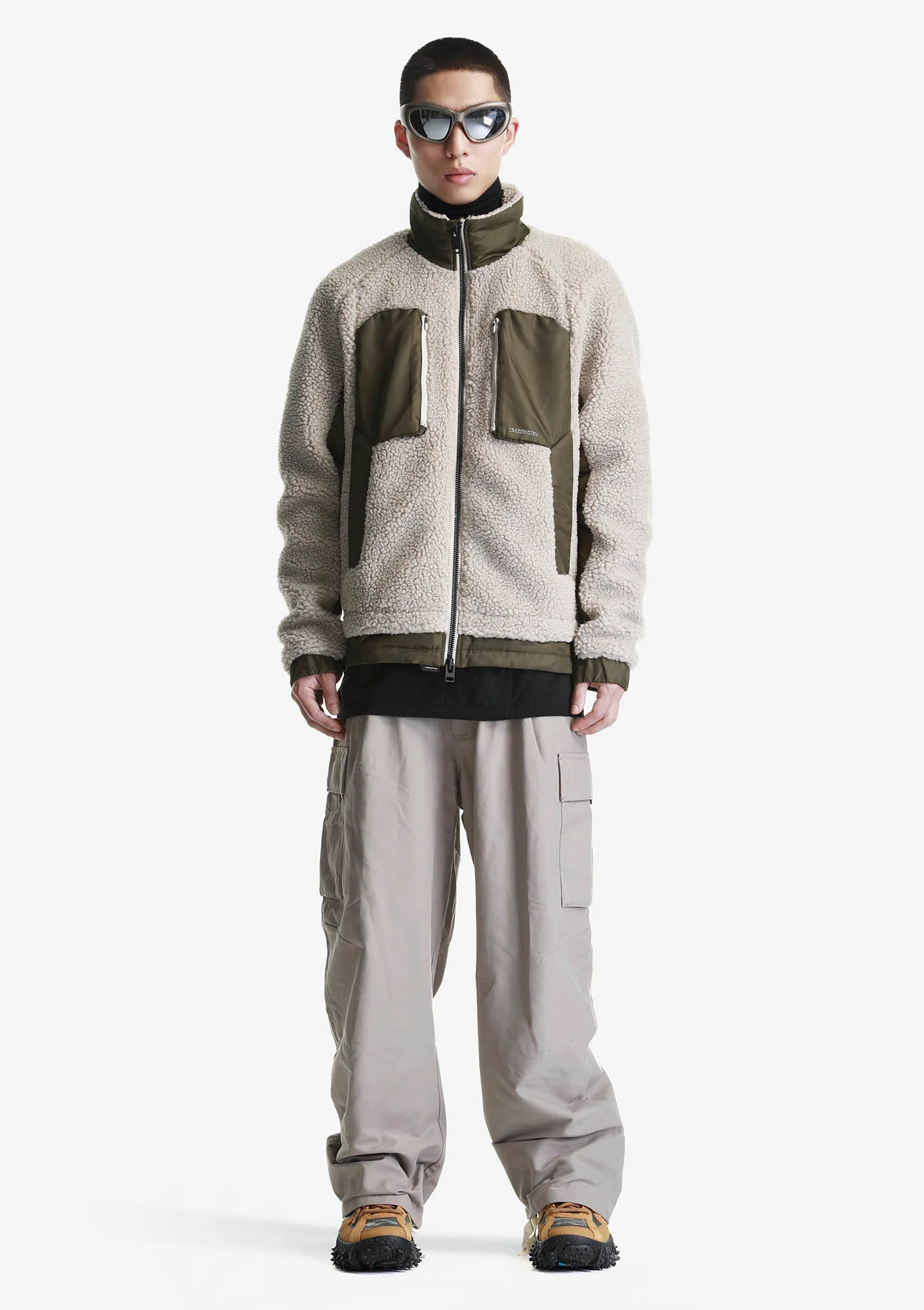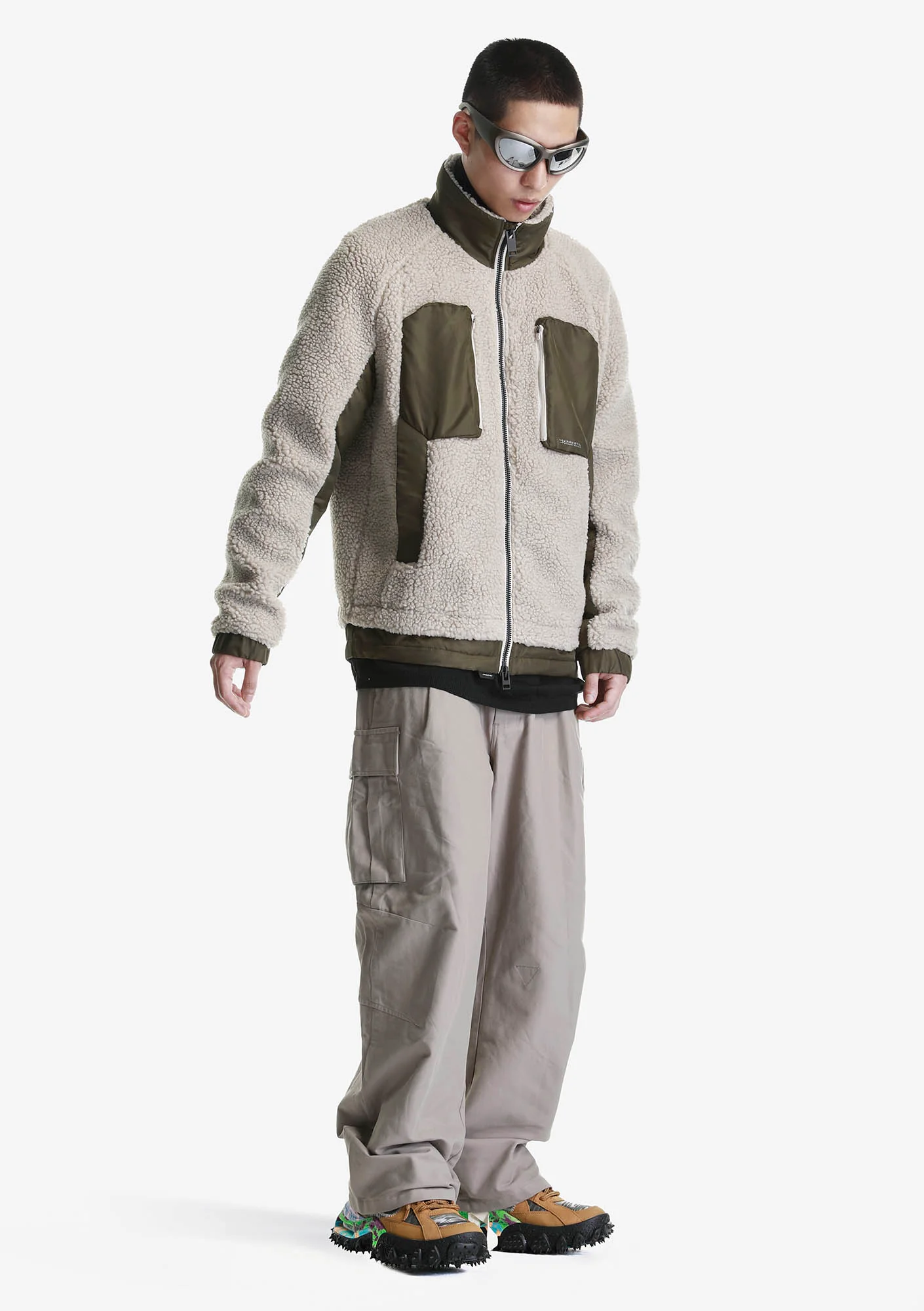 Thick sherpa fleece with curly pile. Durable, elastic, and hypoallergenic. 100% polyester.