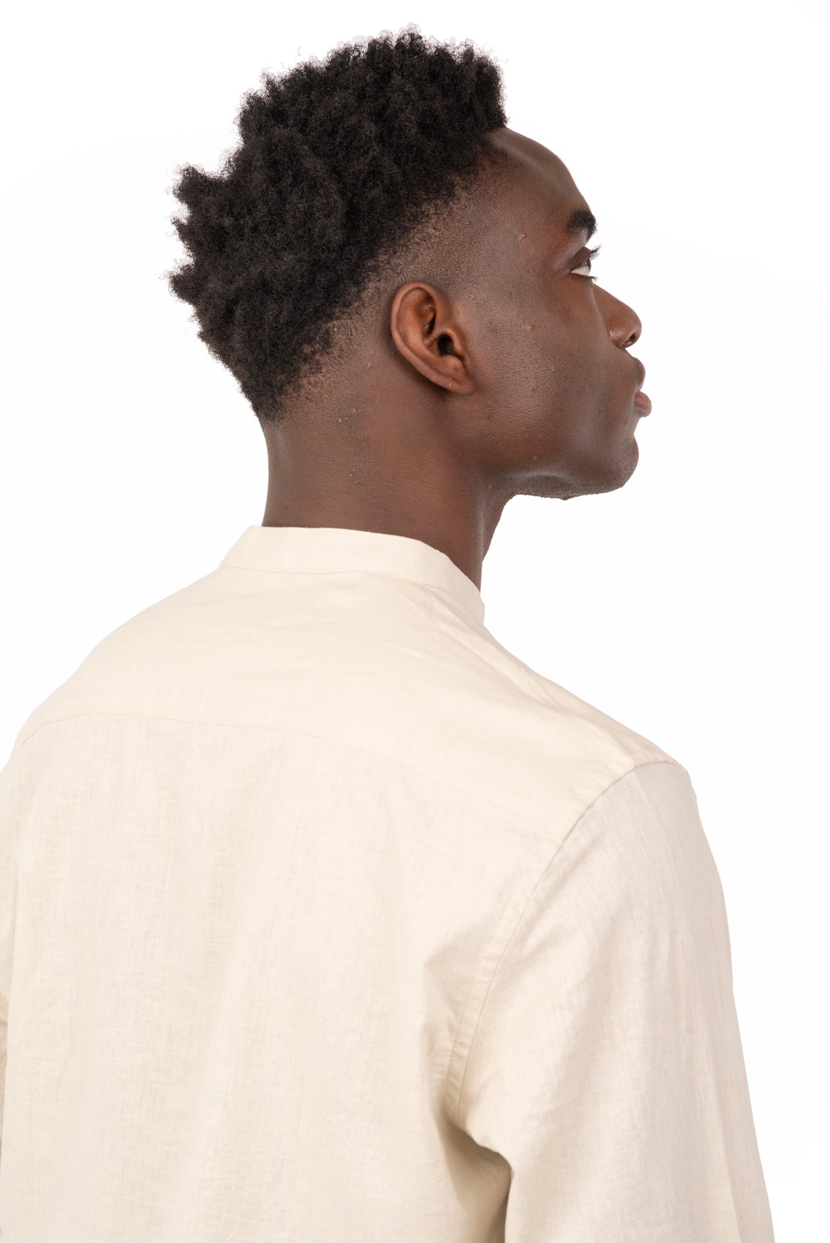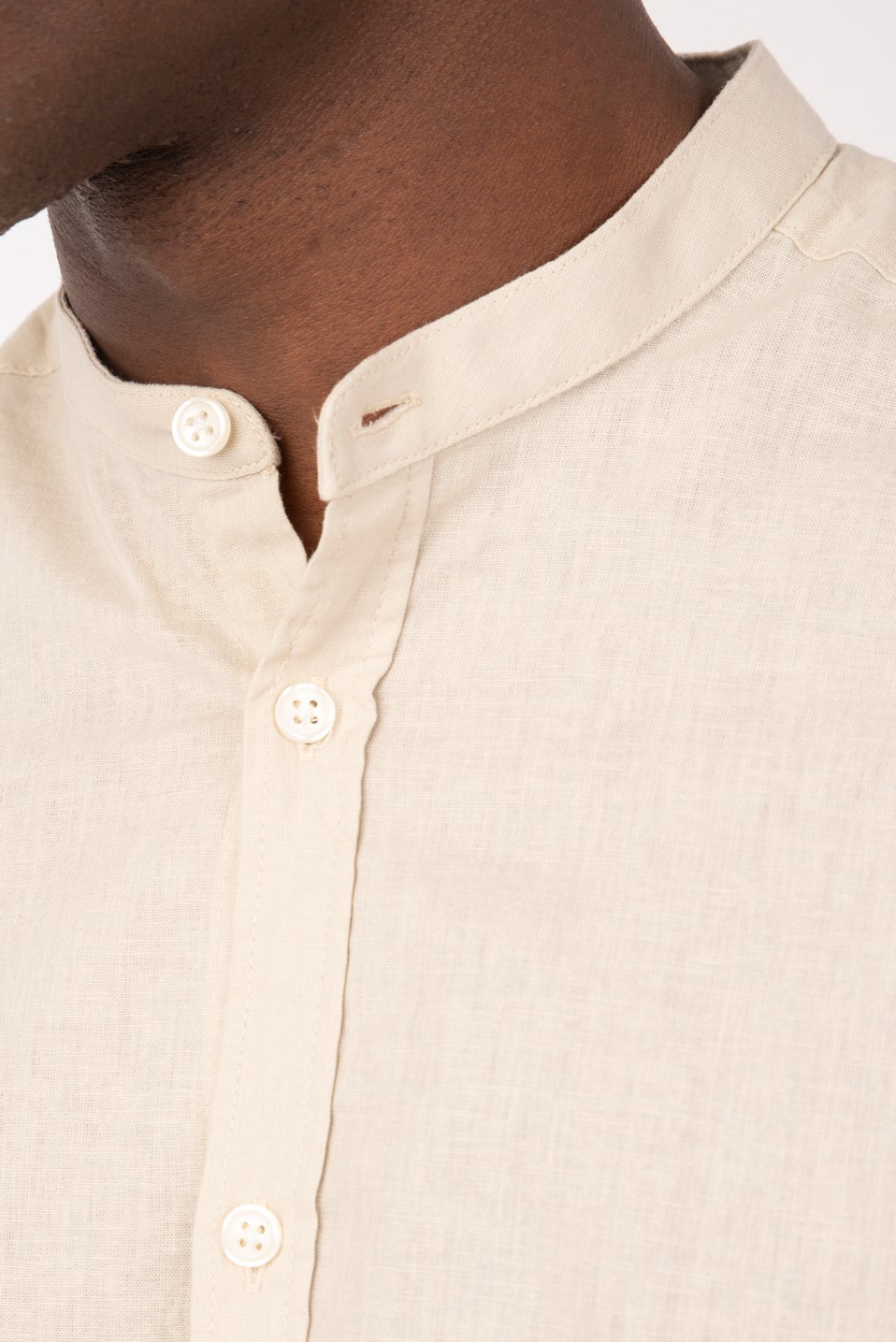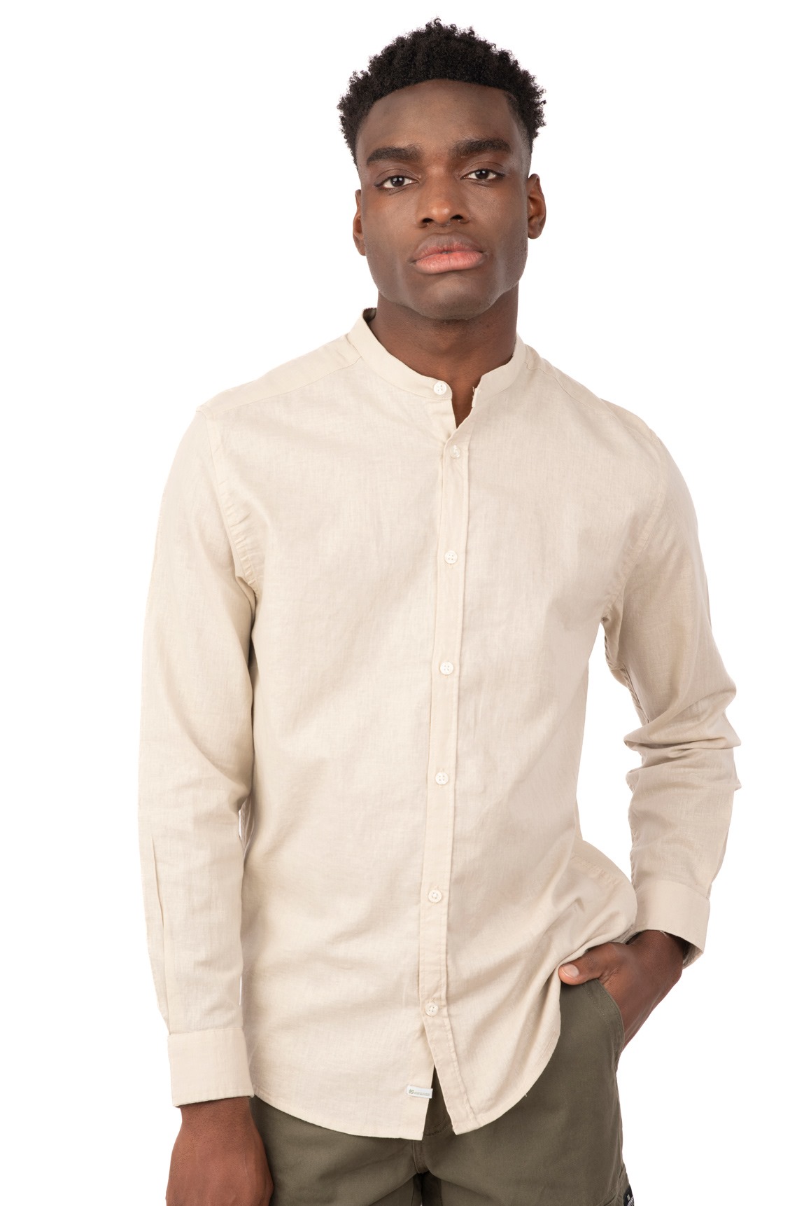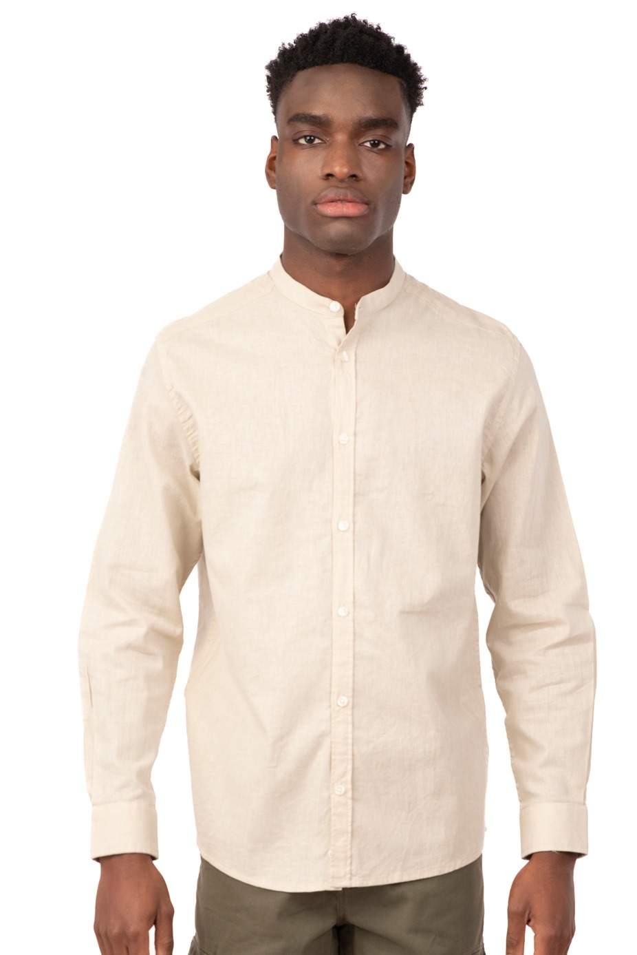 Men’s linen mao collar long sleeve shirt.