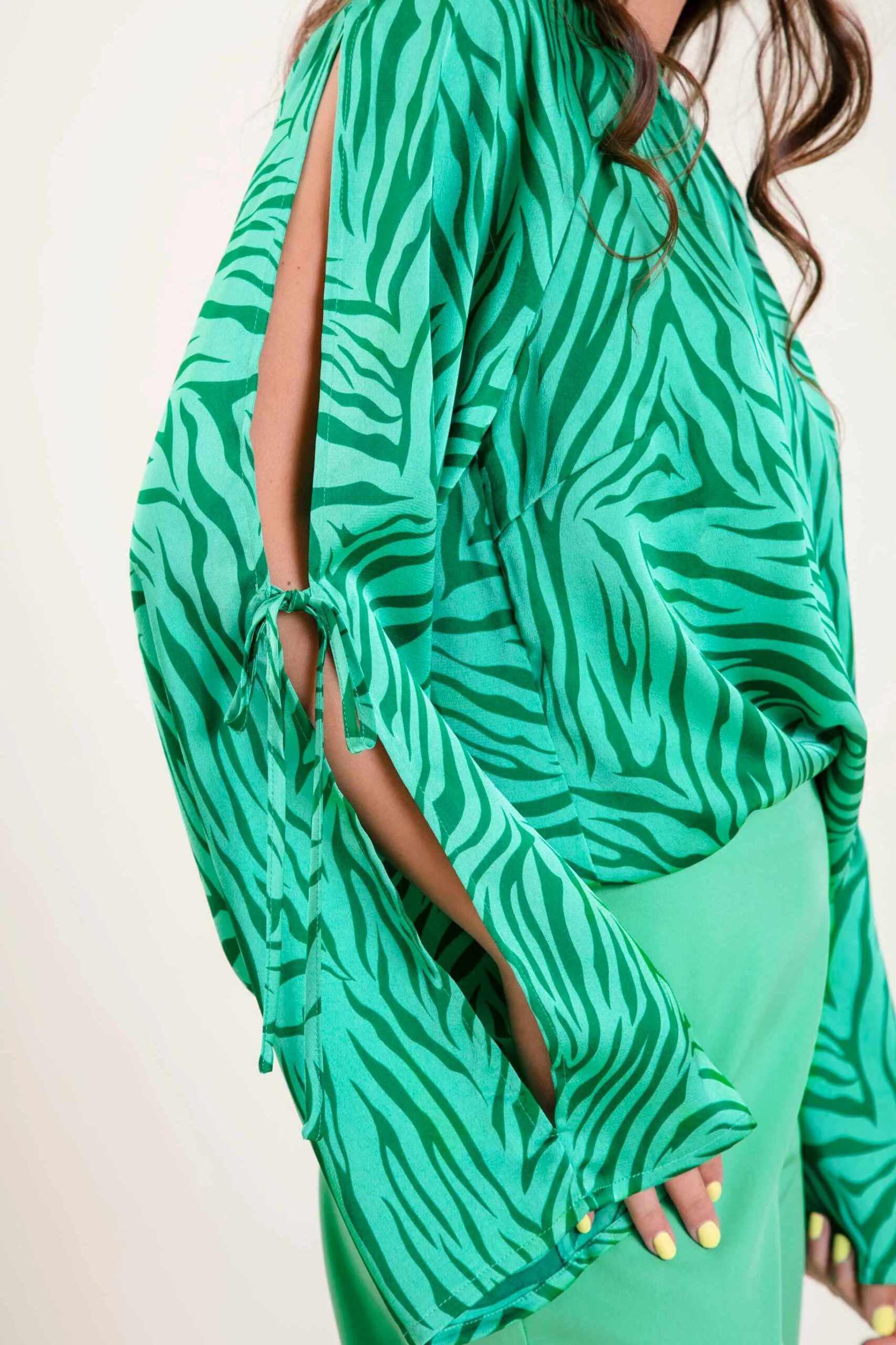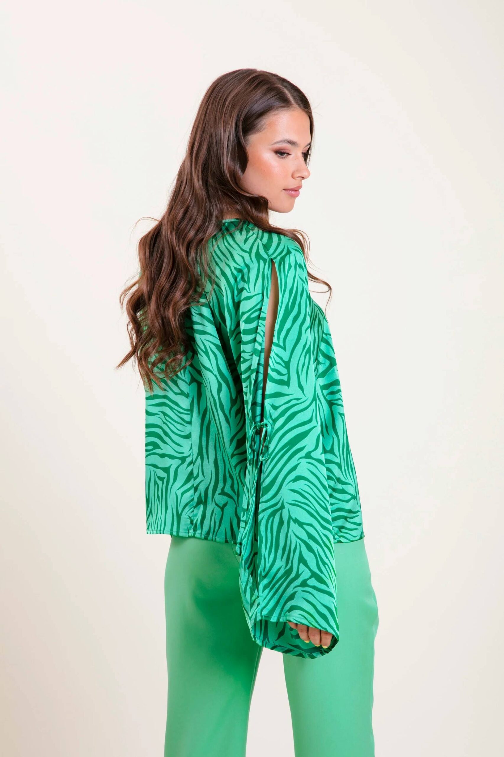The “Alexa Blouse” is a stunning piece featuring a vibrant green zebra print that demands attention. With unique V-arms and a strategically placed cutout detail, it adds a touch of allure to your outfit. The ties complete the look, making it a versatile and stylish choice for a bold fashion statement.