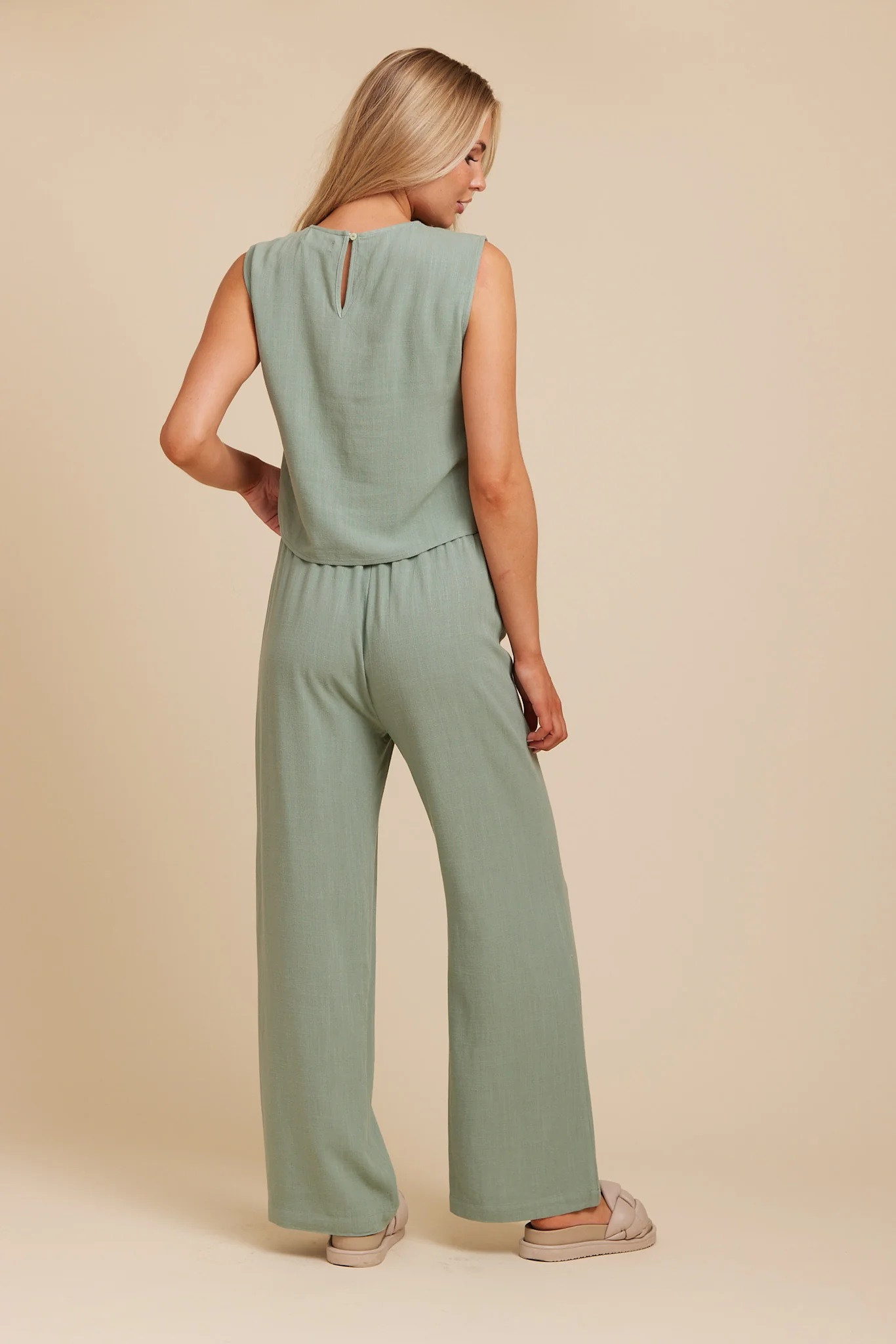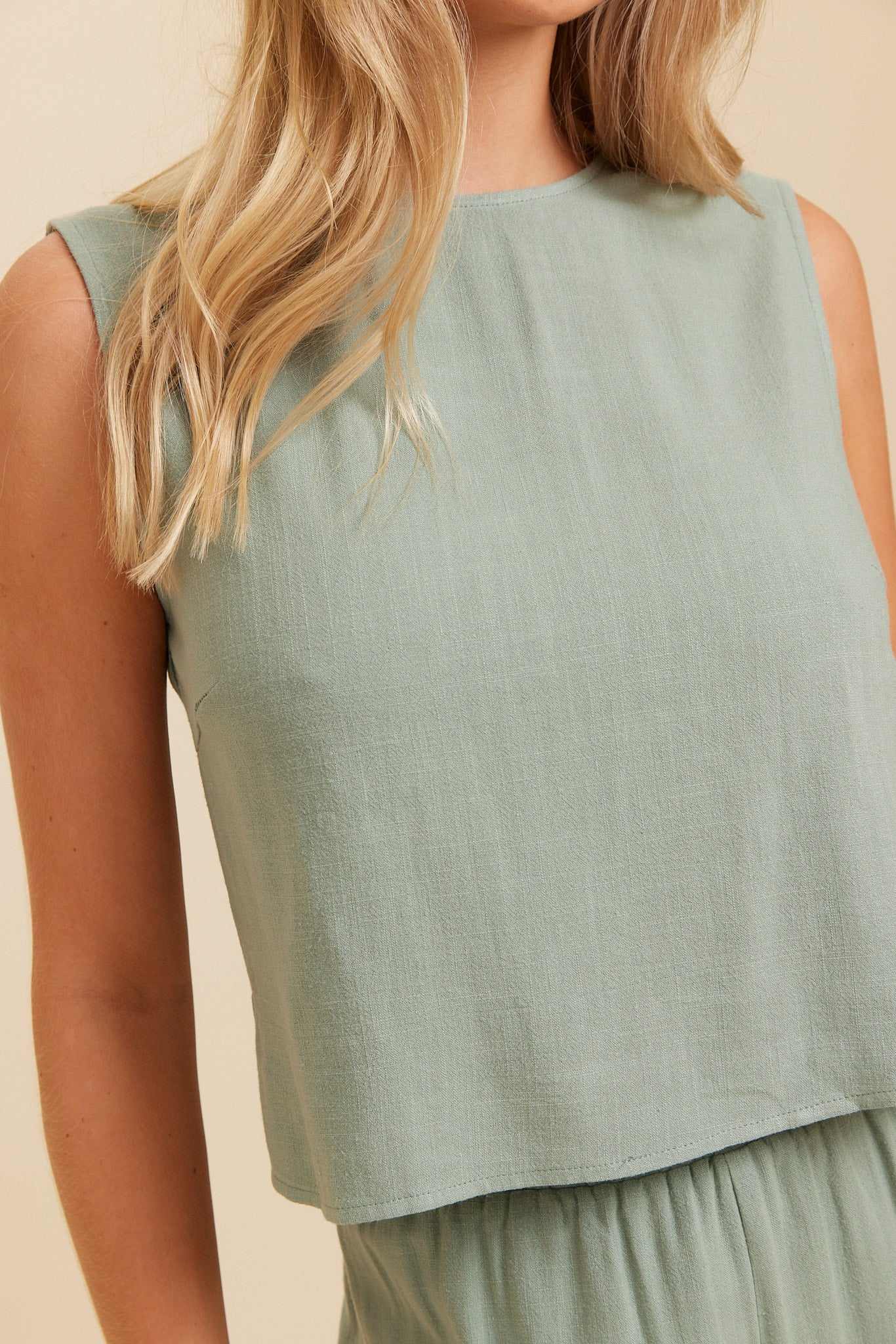 The Jane Linen Top is crafted from a soft linen/viscose blend, featuring a round neck with wide bands and subtle mini slits on the sides.