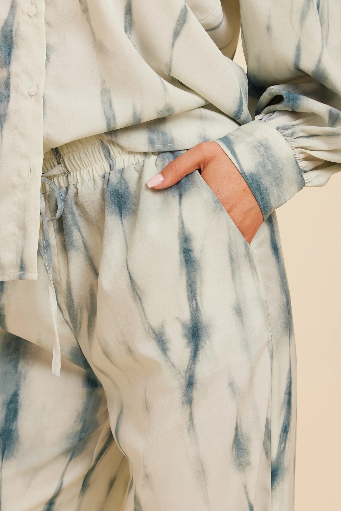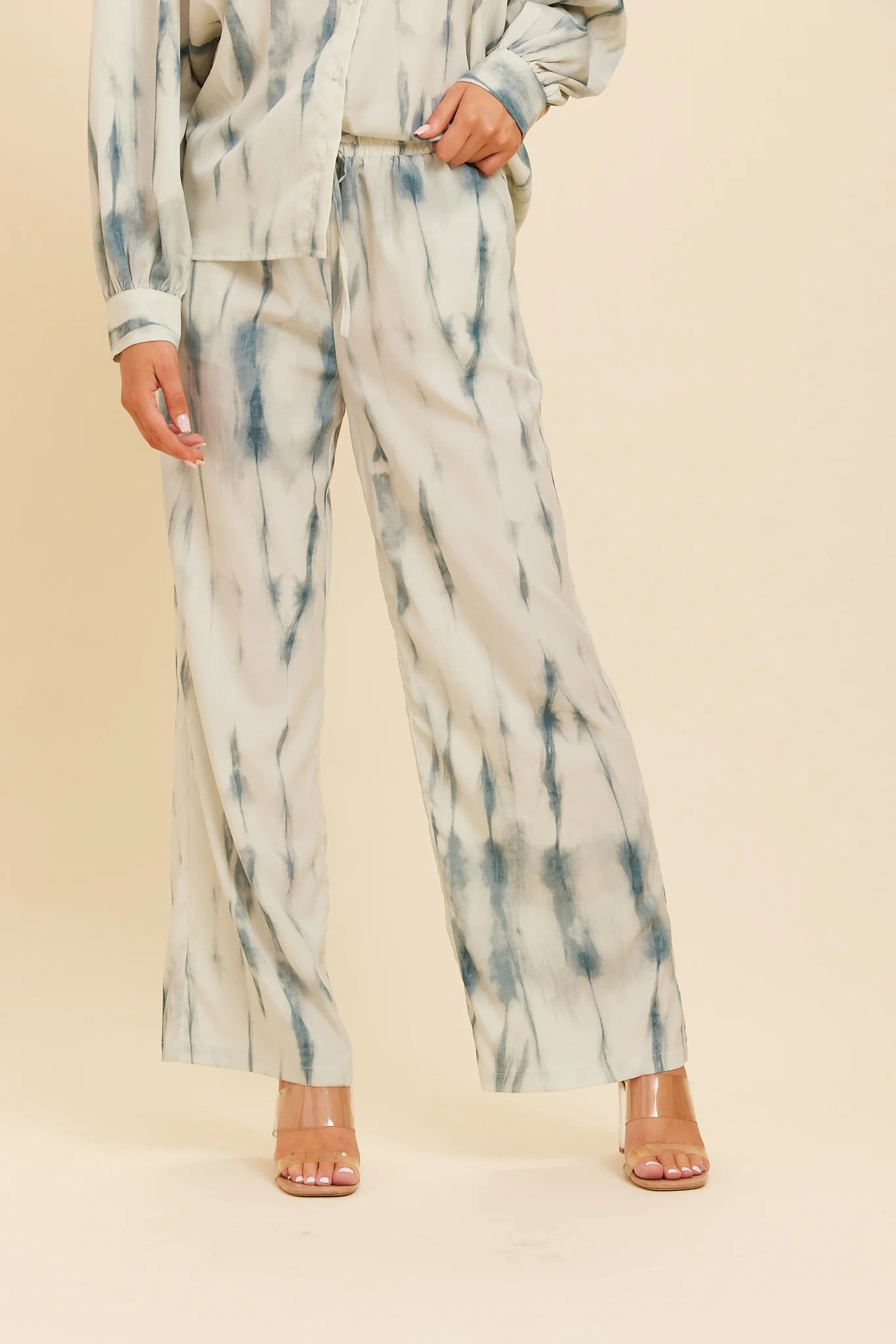 - Alma pant is a trendy bottom crafted from a cool fabric featuring an eye-catching blue blurr print.