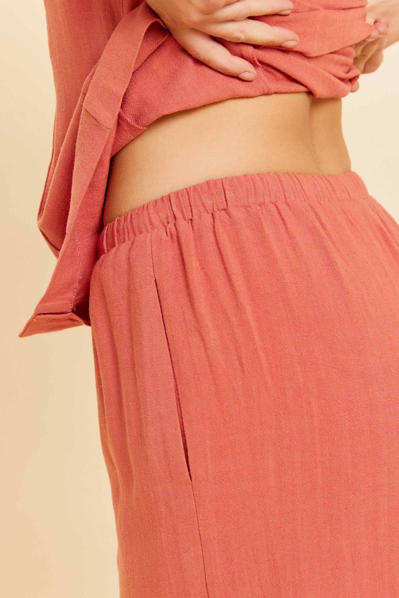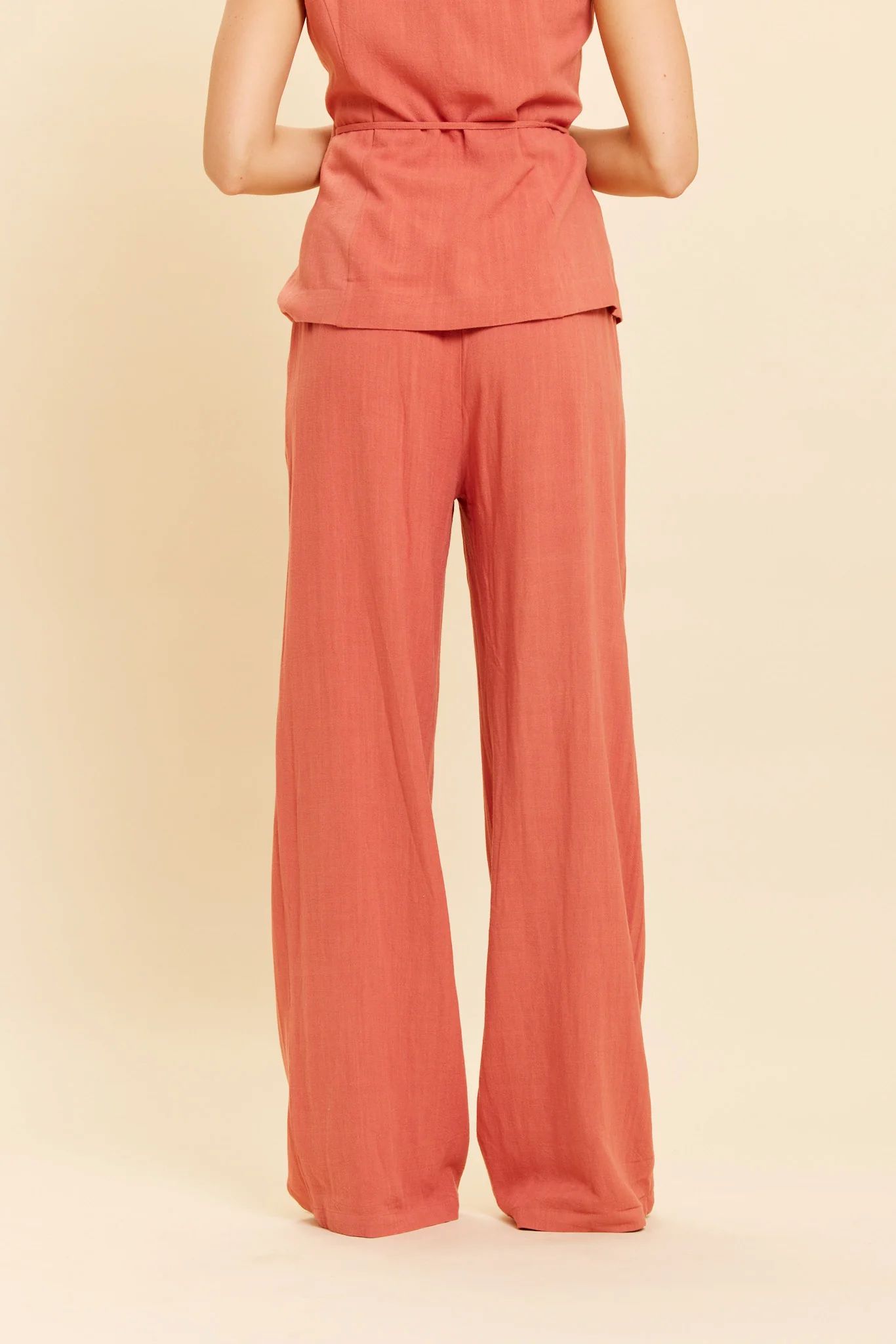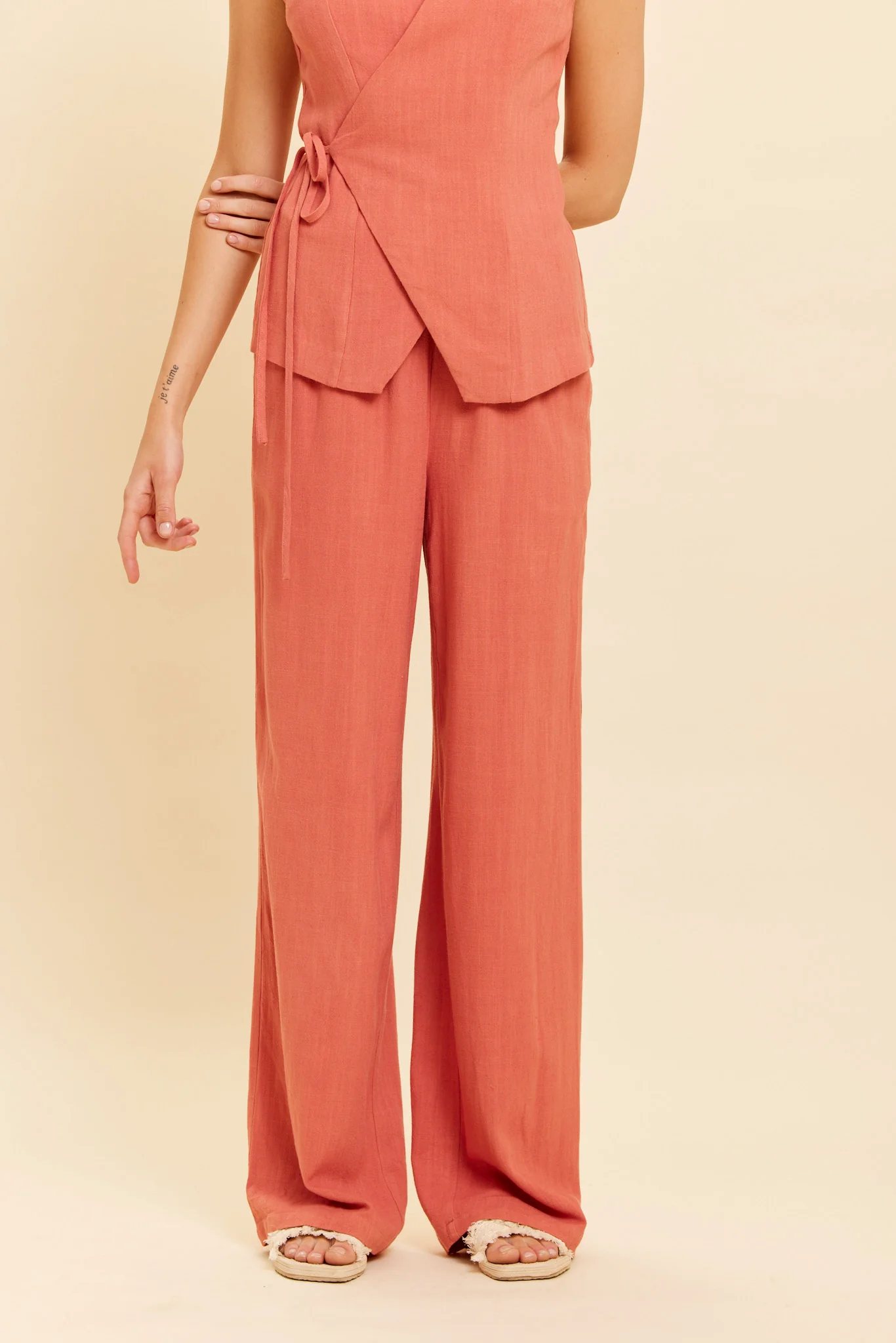 A beautiful linen vest in a terracotta color, featuring a wrap design with a tie band at the side to accentuate the waist. Pair it with the Josephine linen pant for a coordinated terracotta linen set.