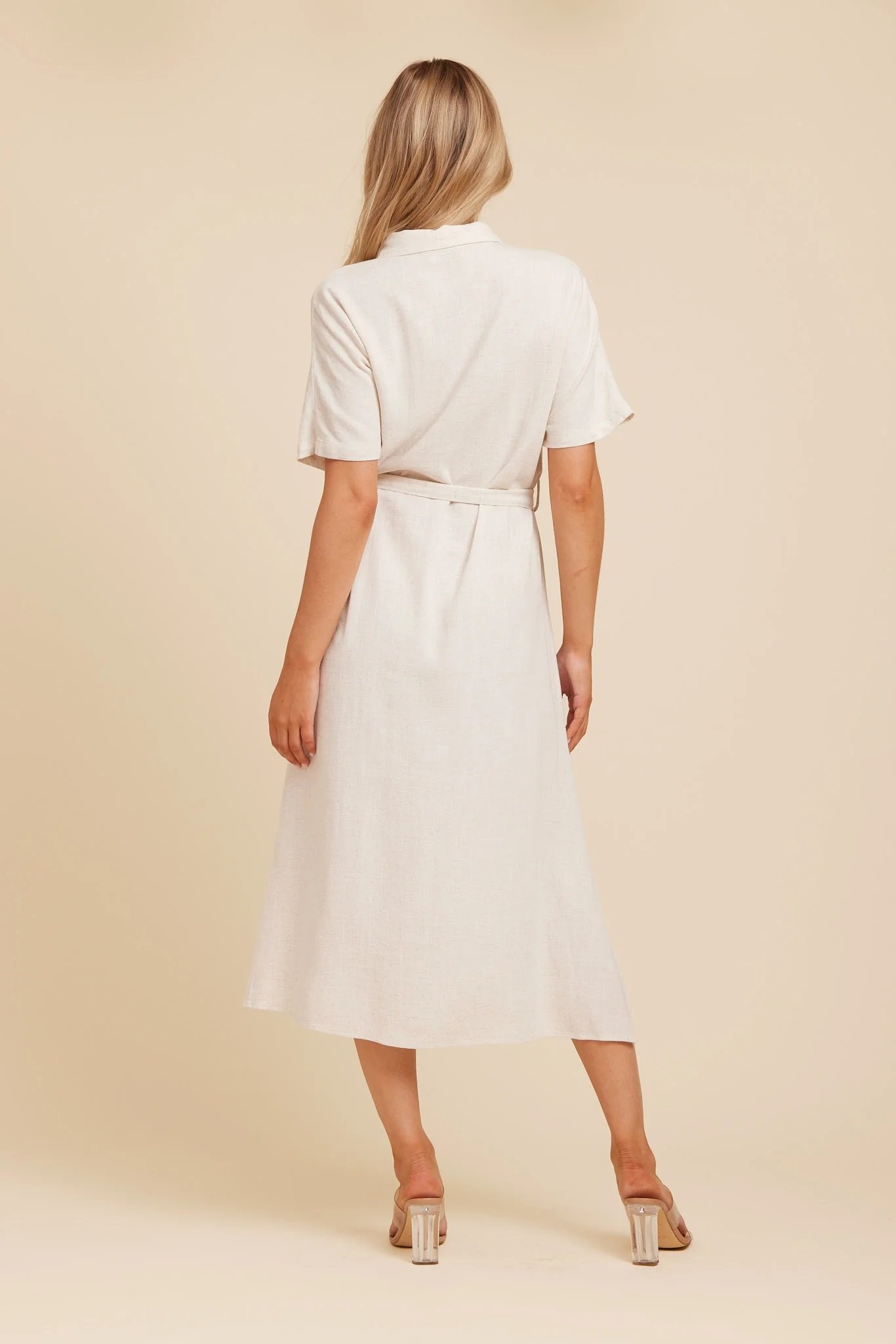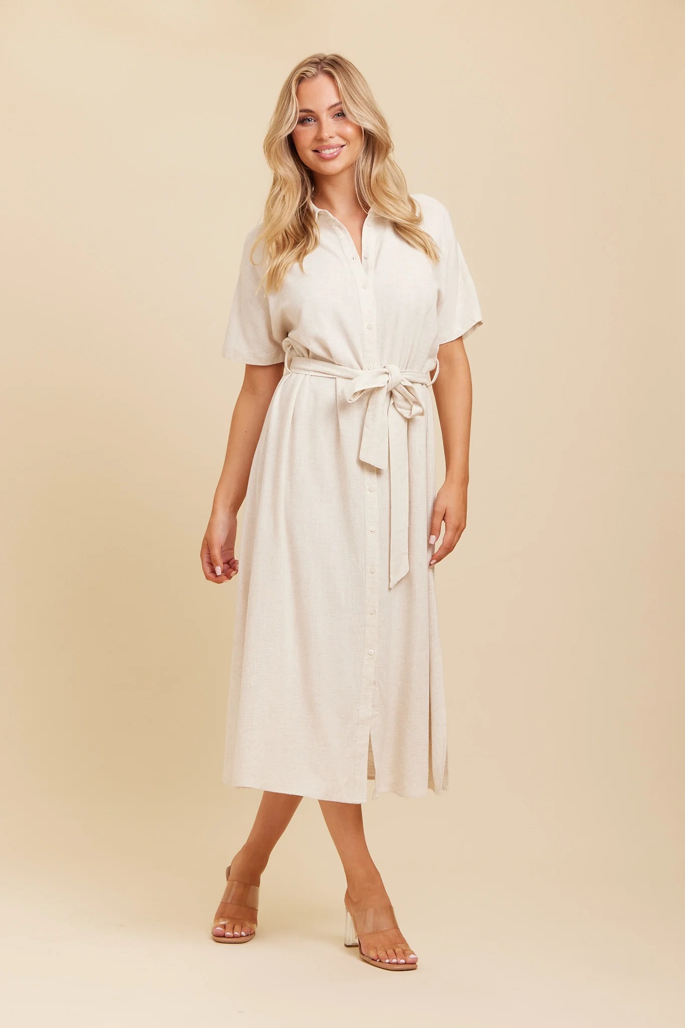 An elegant linen dress with a row of buttons along the front, and a tie at the waist to define and accentuate your figure. This dress offers a classic and sophisticated look for various occasions.