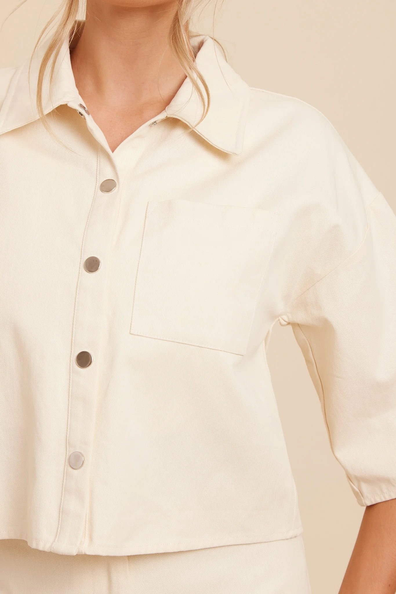 Engla denim jacket, cut slightly shorter in length for a chic look. This jacket features mid-length V-shaped sleeves and front buttons.