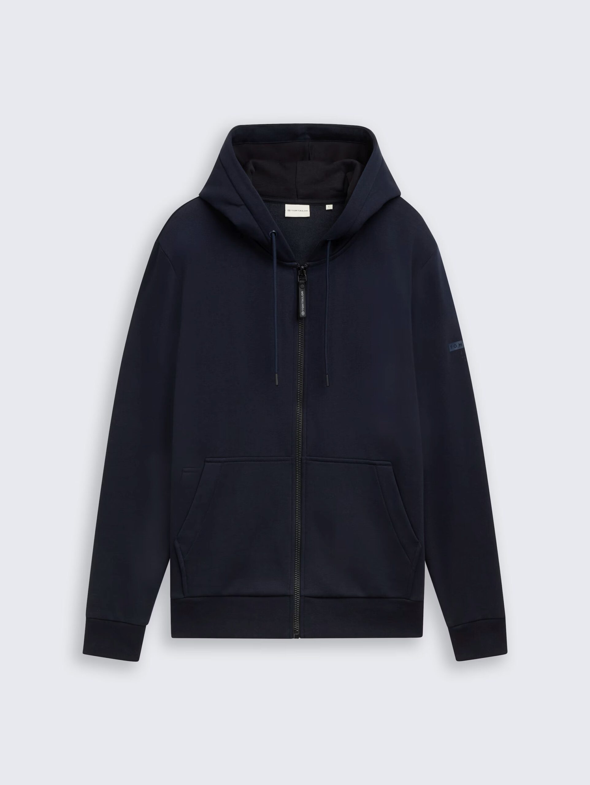 Hoodie sweatshirt jacket with small print on the sleeve, drawstring on the hood and side pockets at the front. Made from a slightly brushed inner lining for a soft and warm feel.