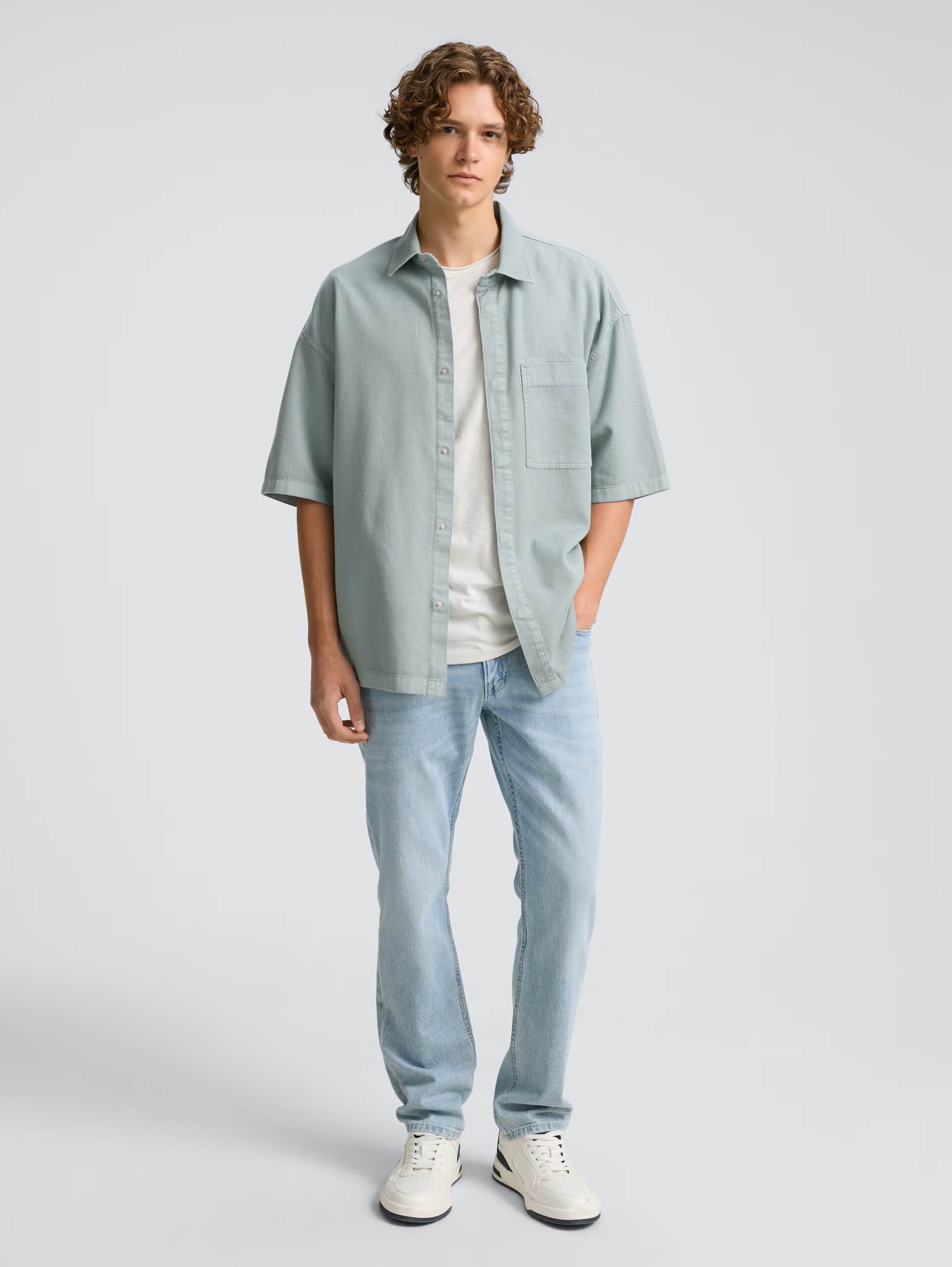- Short-sleeved shirt jacket with patch breast pocket. Made from a textured cotton fabric.